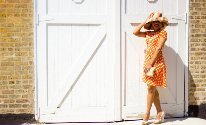 Since I’m embarrassingly ill-equipped in the headwear department (I own exactly one hat. It’s this one. This one isn’t mine. I stole it from a cop.), I headed down to my neighborhood mad hatter for a derby ready topper. If you’re in the Oak Park area, I highly recommend HooDoo Headwear. Their staff was friendly, extremely helpful, and their prices are competitive. Hats are expensive so I wanted one I could wear to multiple events and with a few different colors. They selected for me a beautiful wide brim neutral raffia hat, handmade in Madagascar, and I made it work with a vintage silk orange polka dot dress I scored from a thrift store back in high school.